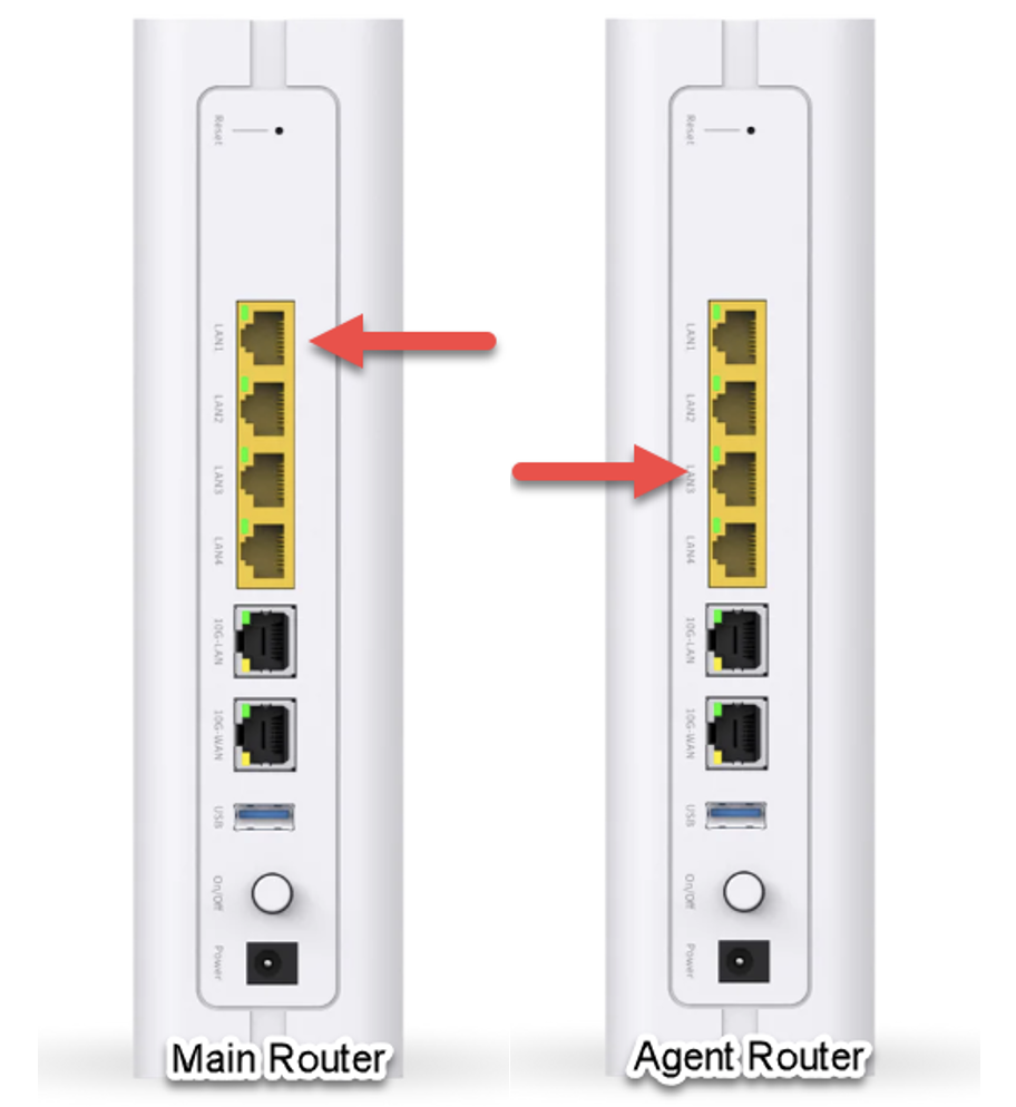 Plug the Ethernet Cable from Main Router’s LAN Port (1G/10G)   to the 2nd Router’s (Agent Router) LAN Port (1G/10G)