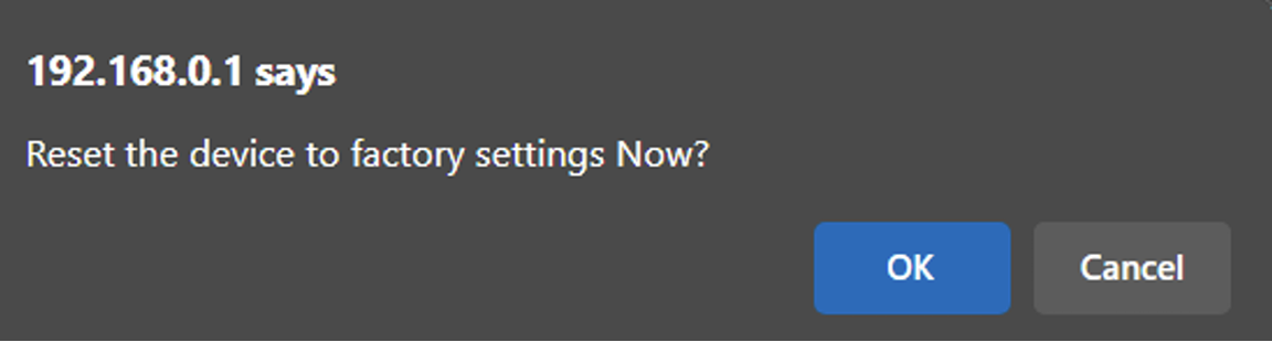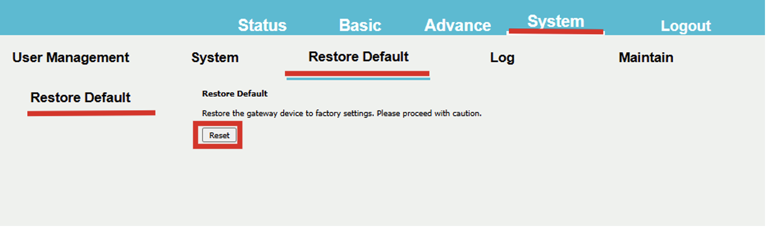 After logging in, click on System tab, then select Restore Default, and click Reset